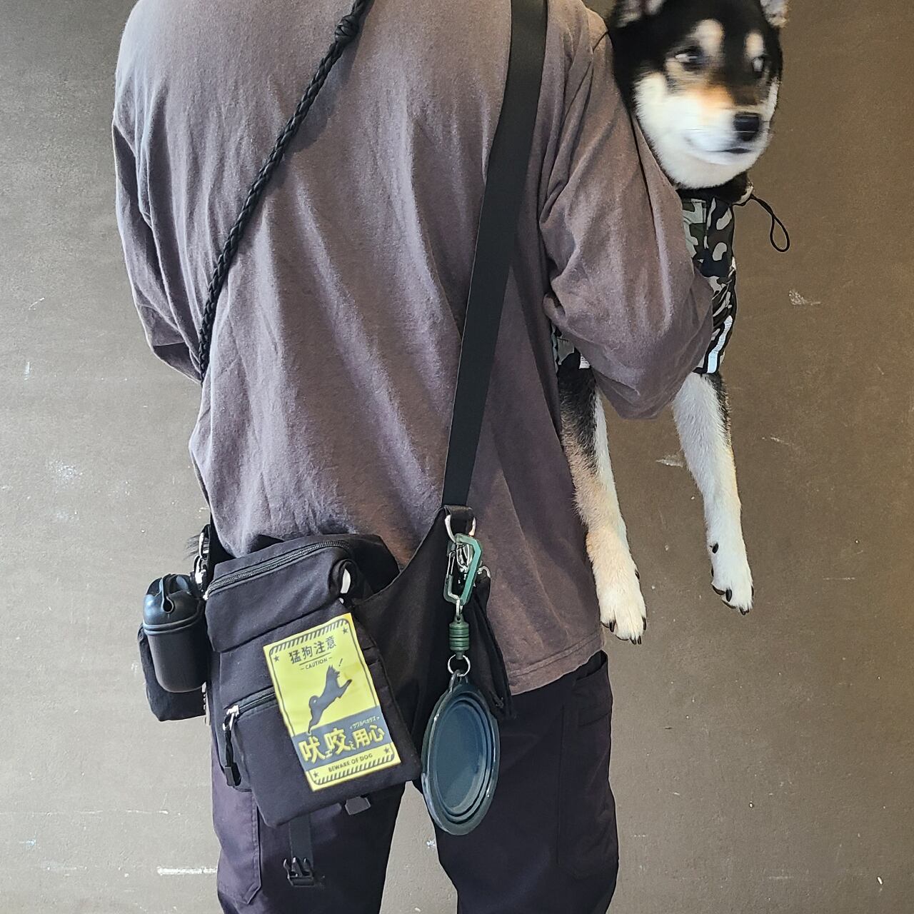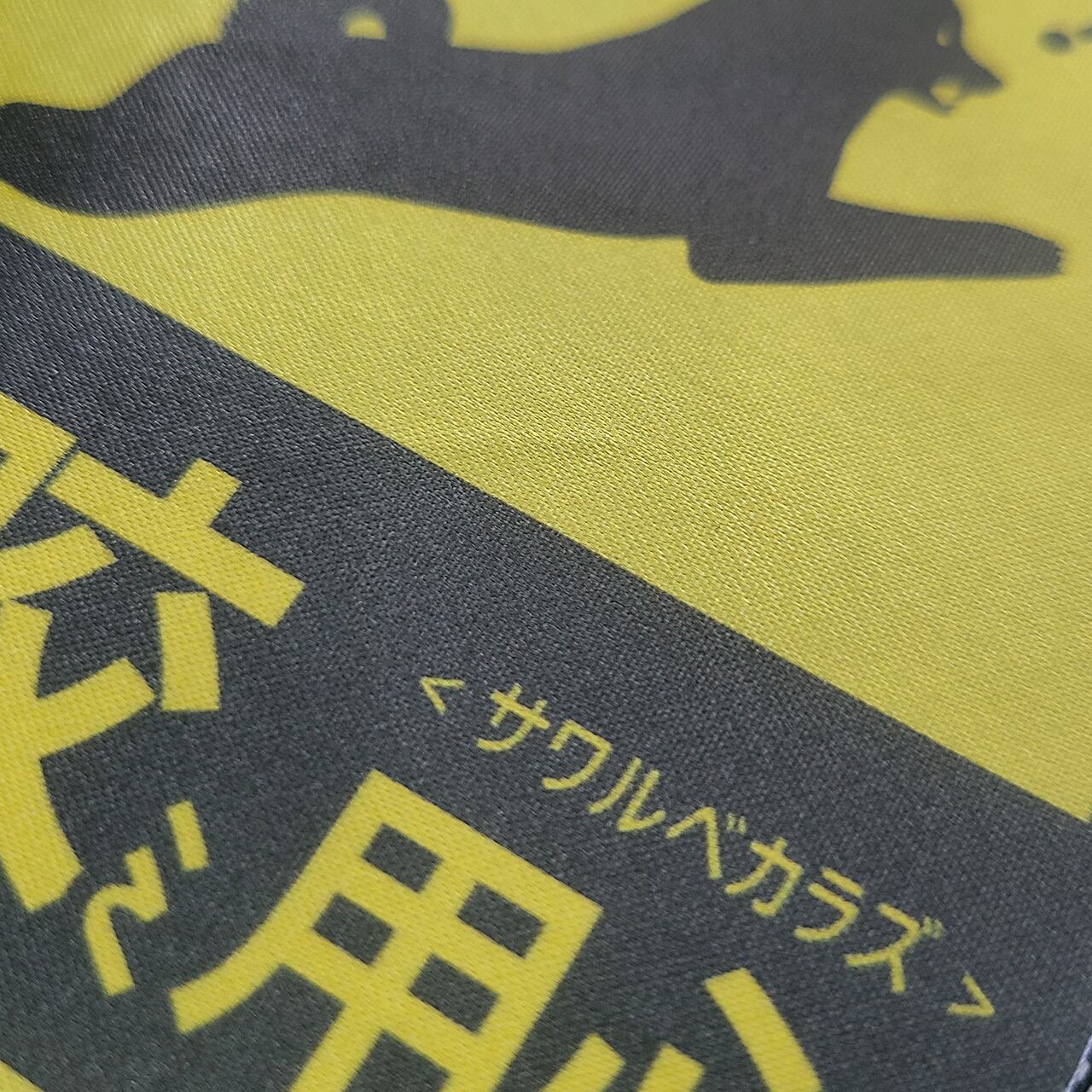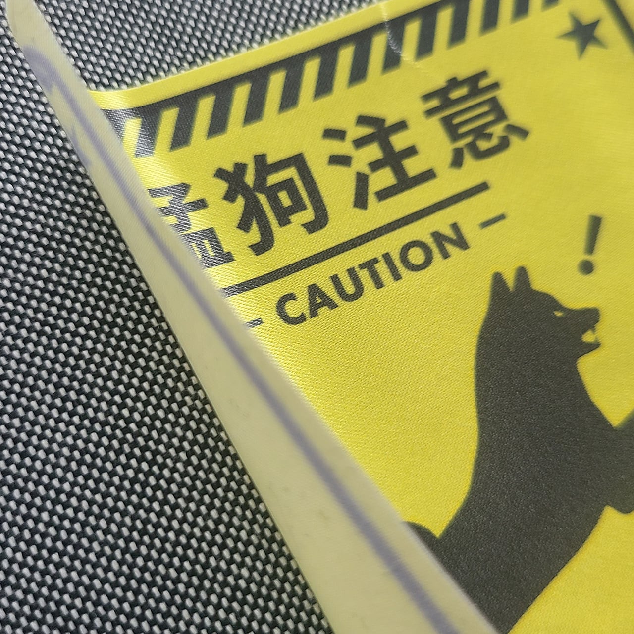 サテンシール「猛狗注意」は、布に貼れるタイプのシールです。お散歩バッグやお散歩ウェアなどにご利用いただけます。