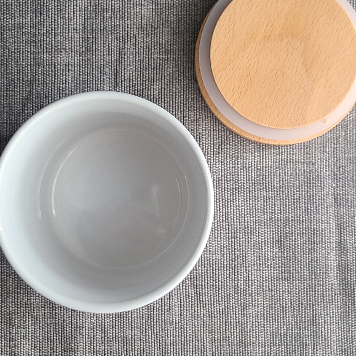 木製の蓋(シリコンパッキン付き)ありの温かみのある陶器のキャニスター。