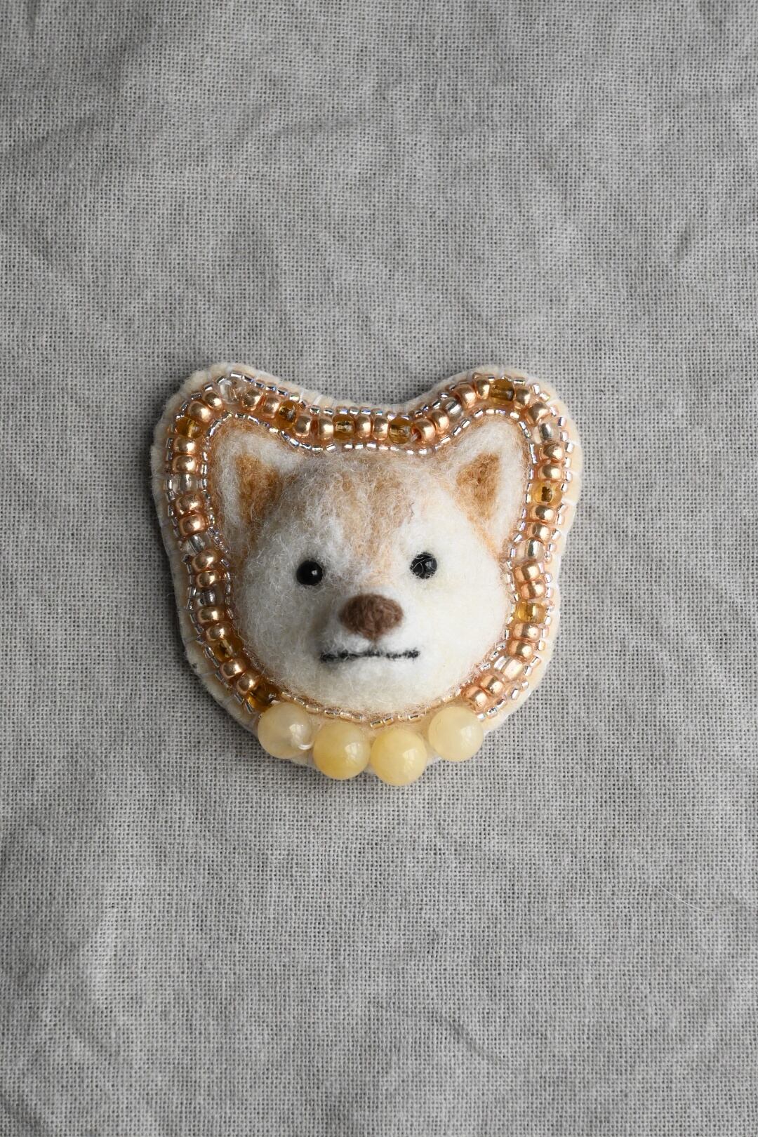 羊毛シバブローチ・白柴(イエロージェイド)