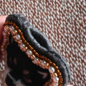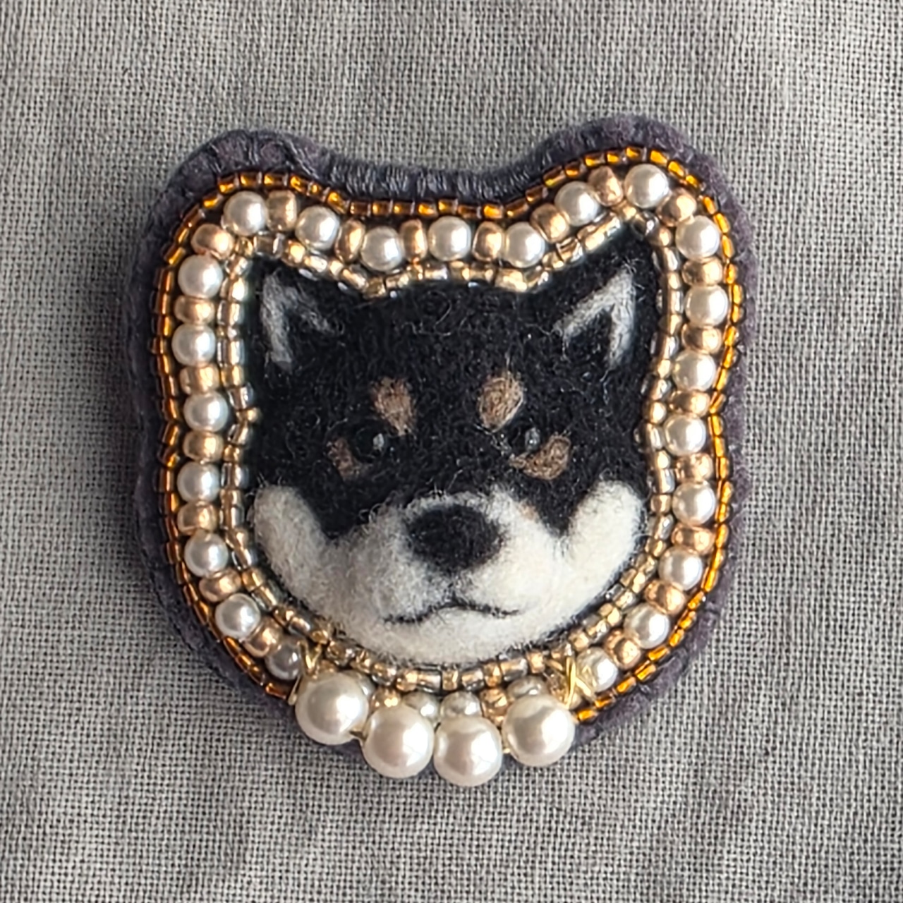 首もとをパール(日本製プラスチックパール)でお洒落した黒柴さんブローチ。