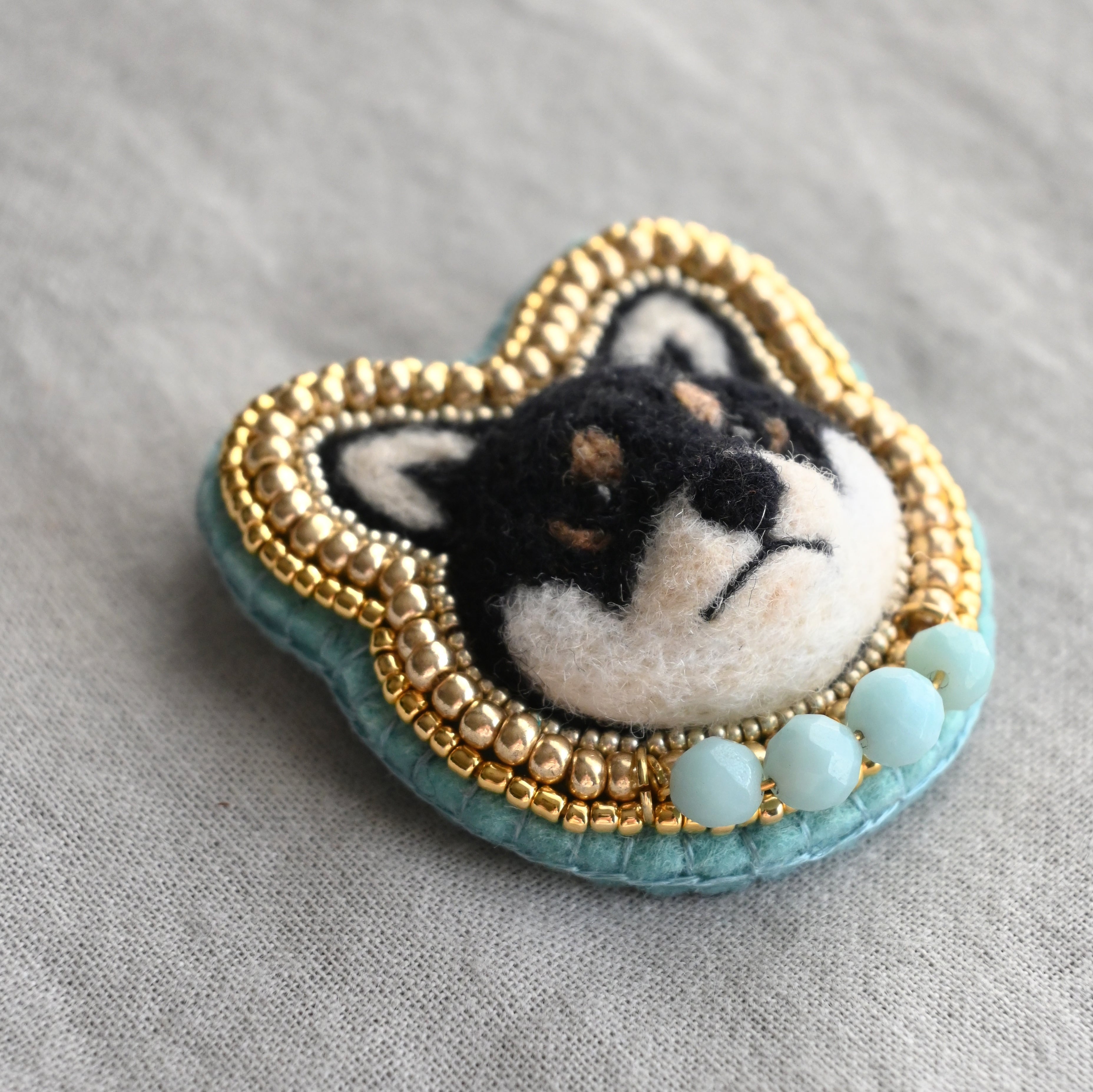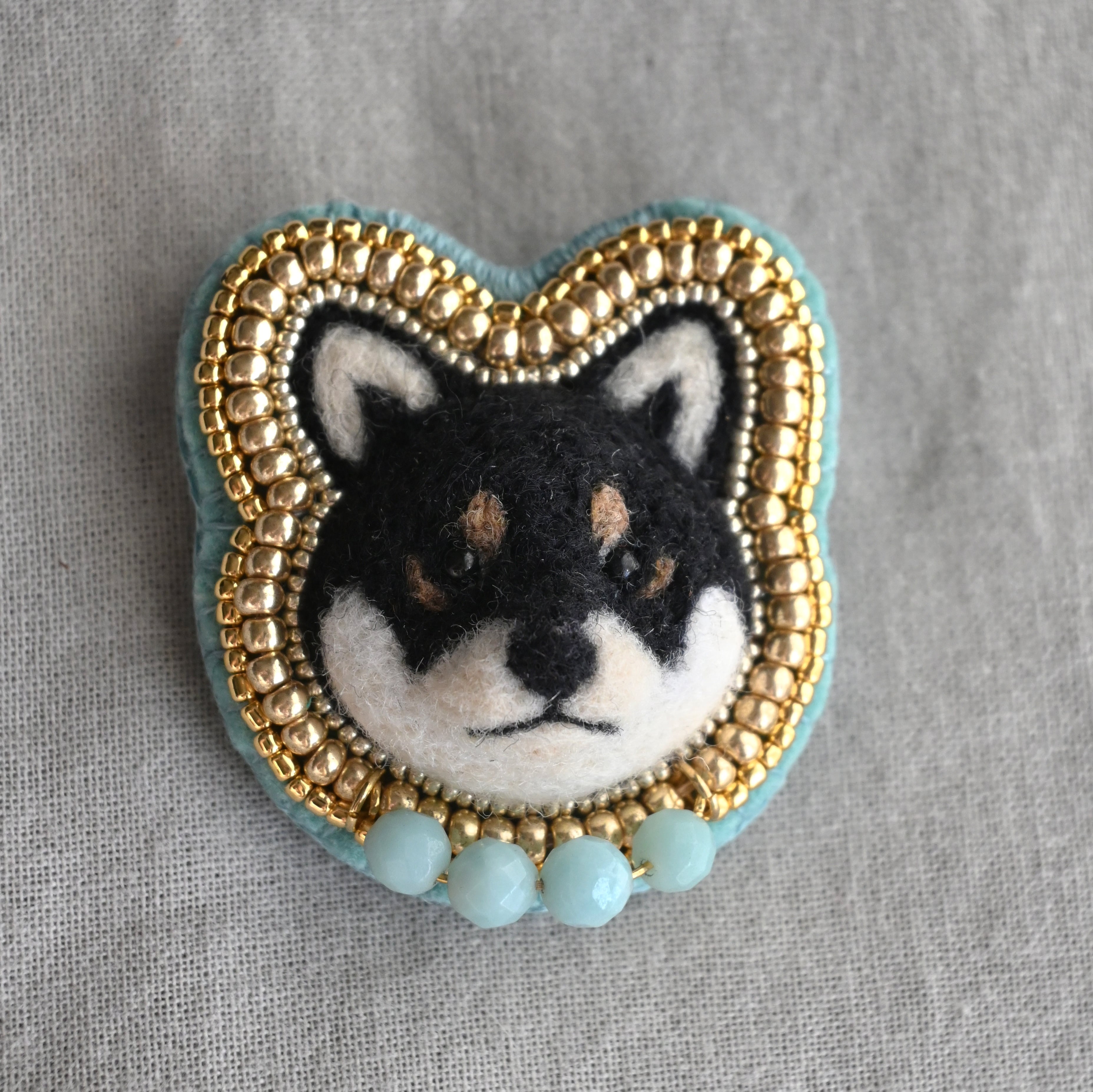 首もとをライトブルーの天然石(アマゾナイト)でお洒落した赤柴さんブローチ。