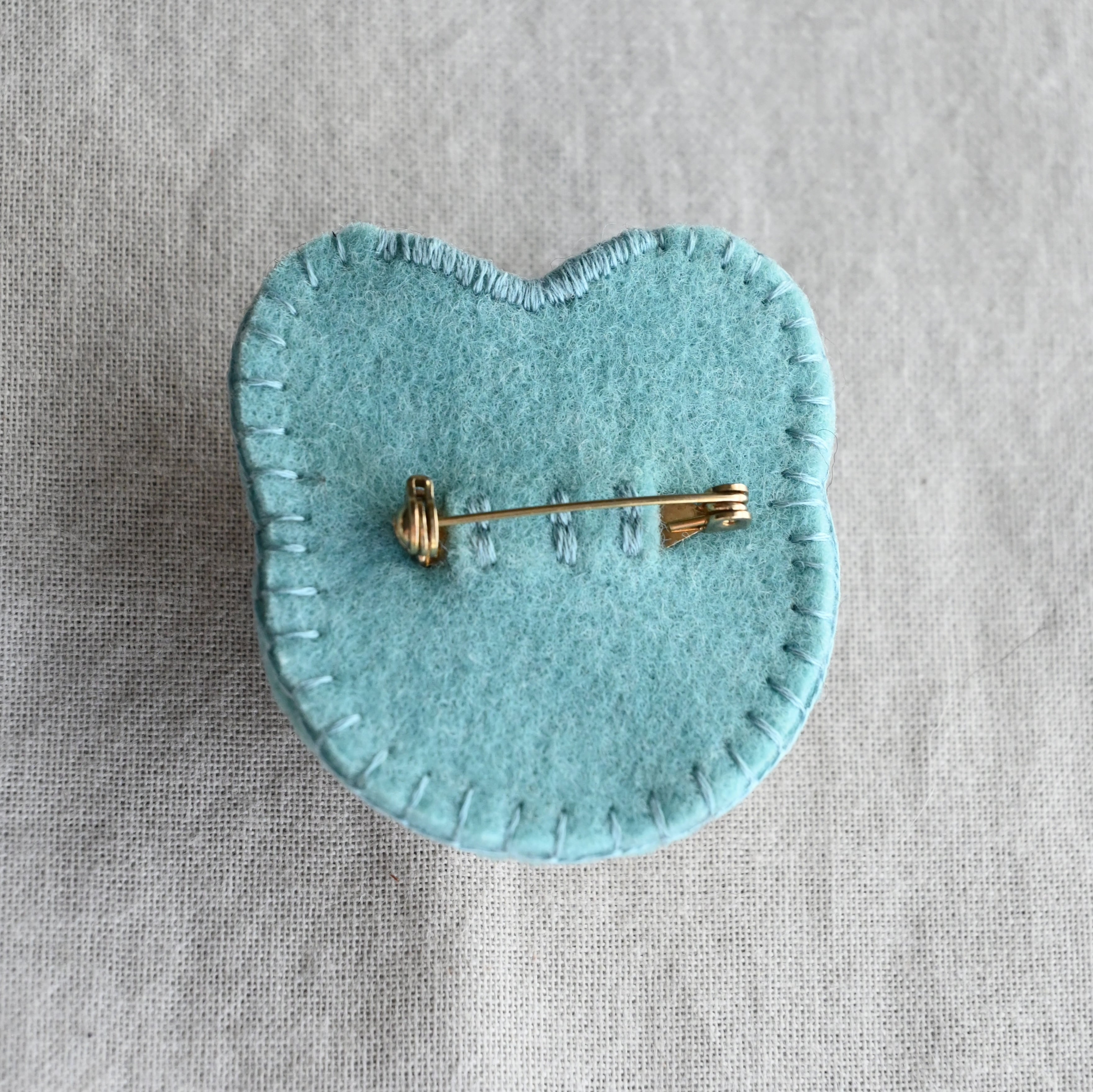 おでかけに連れていくもよし、布につけて飾るもよしのブローチピンタイプ。